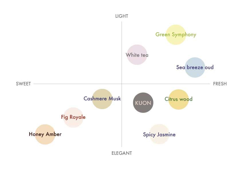 それぞれのムエットには、トップ・ミドル・ベースや香りの特長がわかるデザインを施しています。ただ香るだけではなく、“どのように変化していくのか”を視覚的にも理解できる構成です。感覚だけに頼らず、言葉とともに香りを選ぶことができます。